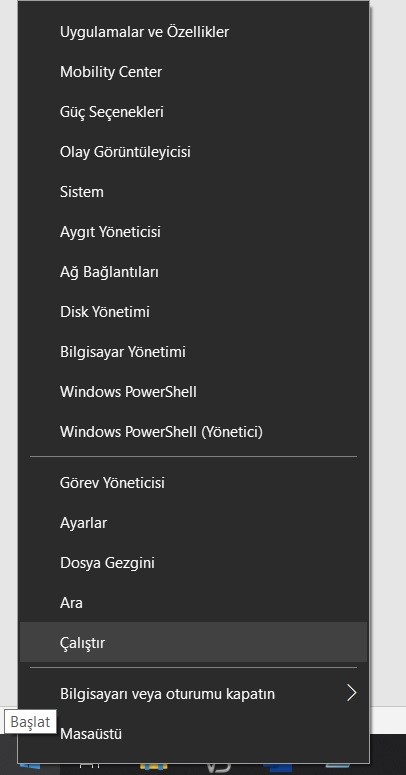 - Klavyede Windows pencere tuşu ve “R” tuşuna aynı anda basın veya başlat düğmesine mouse ile sağ tuşa tıklayıp “çalıştır” öğesini seçin.