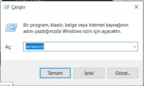 - Çıkan ekrana “winword” yazıp enter veya tamam butonuna tıklayın.